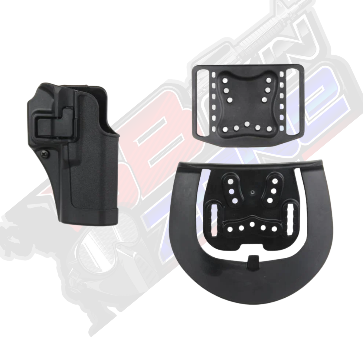ซองปืนพกนอก ทรง Black Hawk รุ่น Glock17 สำหรับปืน : Glock 17/22/31 (Gen1-4) คุณสมบัติ : #ซองปืนพกนอกปลดนิ้วชี้ มือขวา #มาพร้อมเพลตร้อยเข็มขัด และ เพลตเหน็บเอวได้ #ซองปืนสามารถปรับองศาได้3ระดับ