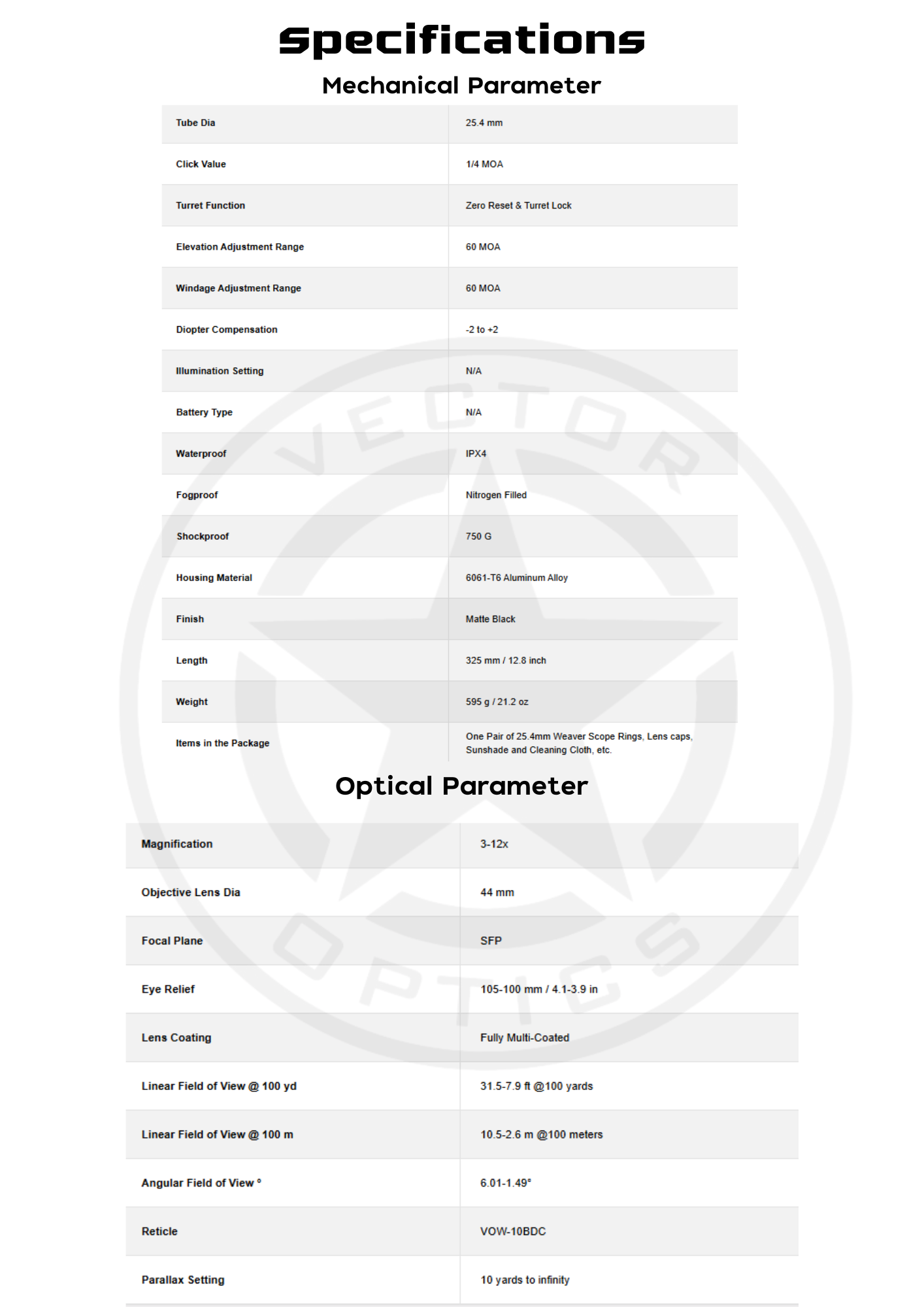 • Second Focal Plane VOW-10BDC Reticle Compensate for Bullet Drop and Windage