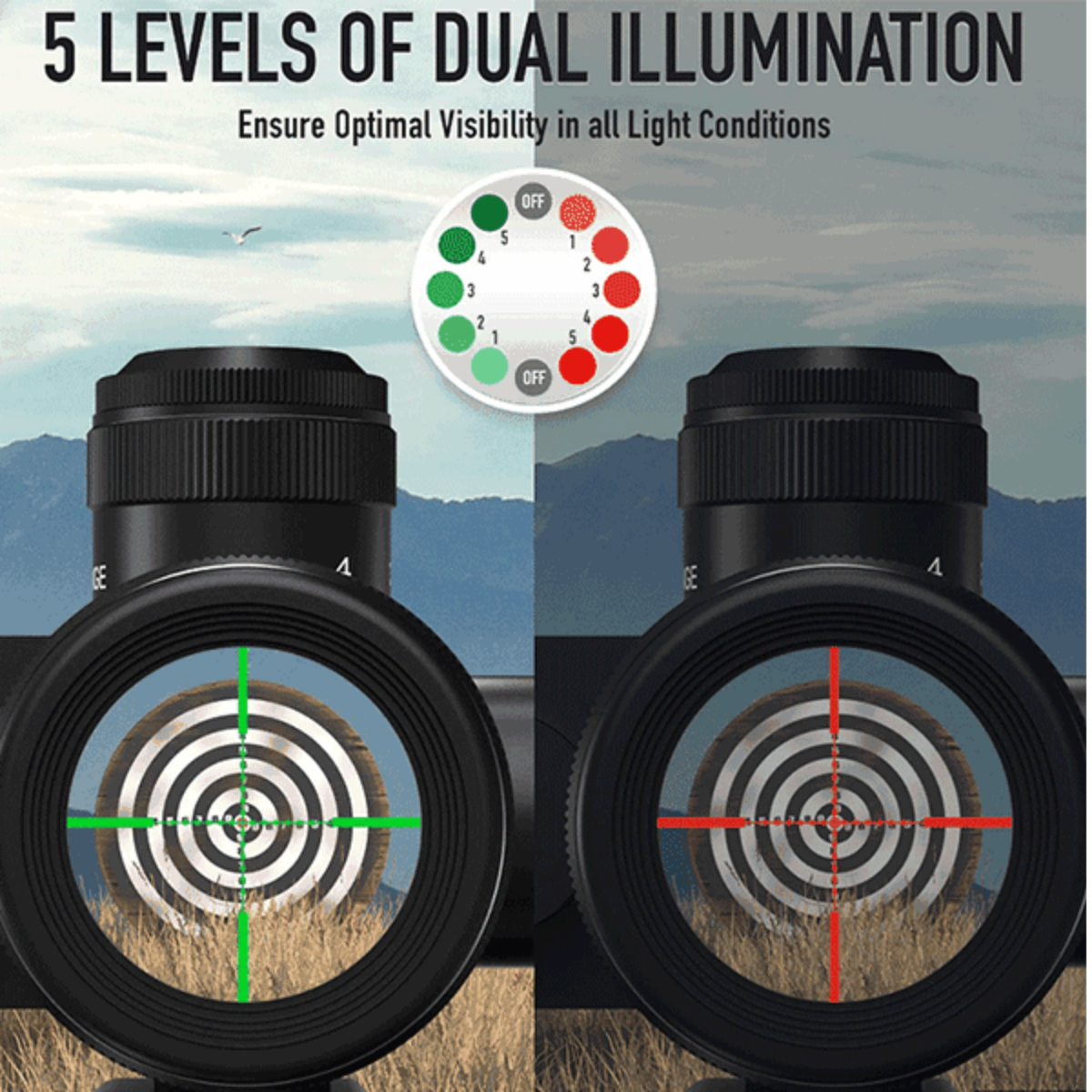 The VI-CTSIX MIL type reticle on this 1-6x LPVO scope offers 5-step green and red brightness, delivering high visibility across all environments.