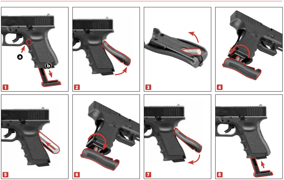 ร่องนิ้วที่เด่นชัดบนด้ามจับของ GLOCK 19 รุ่นคอมแพ็คนี้ ช่วยให้การควบคุมปืนเป็นไปอย่างมั่นคงและปลอดภัยแม้ขณะสวมถุงมือ ซึ่งถือเป็นคุณลักษณะเด่นของดีไซน์ในรุ่น Gen4 นอกจากนี้ยังมีเครื่องมือเจาะแก๊สติดตั้งมาในตัวบริเวณหลังด้าม (Backstrap) ช่วยให้เปลี่ยนหลอดแก๊ส CO₂ ขนาด 12 กรัม ได้อย่างรวดเร็วระหว่างการแข่งขัน ส่วนราง Weaver บริเวณใต้ลำกล้องรองรับการติดตั้งอุปกรณ์เสริมมาตรฐาน เช่น ไฟฉายหรือเลเซอร์ และระบบเซฟตี้ที่ไกปืนตามแบบฉบับดั้งเดิมช่วยป้องกันการลั่นไกโดยไม่ตั้งใจ