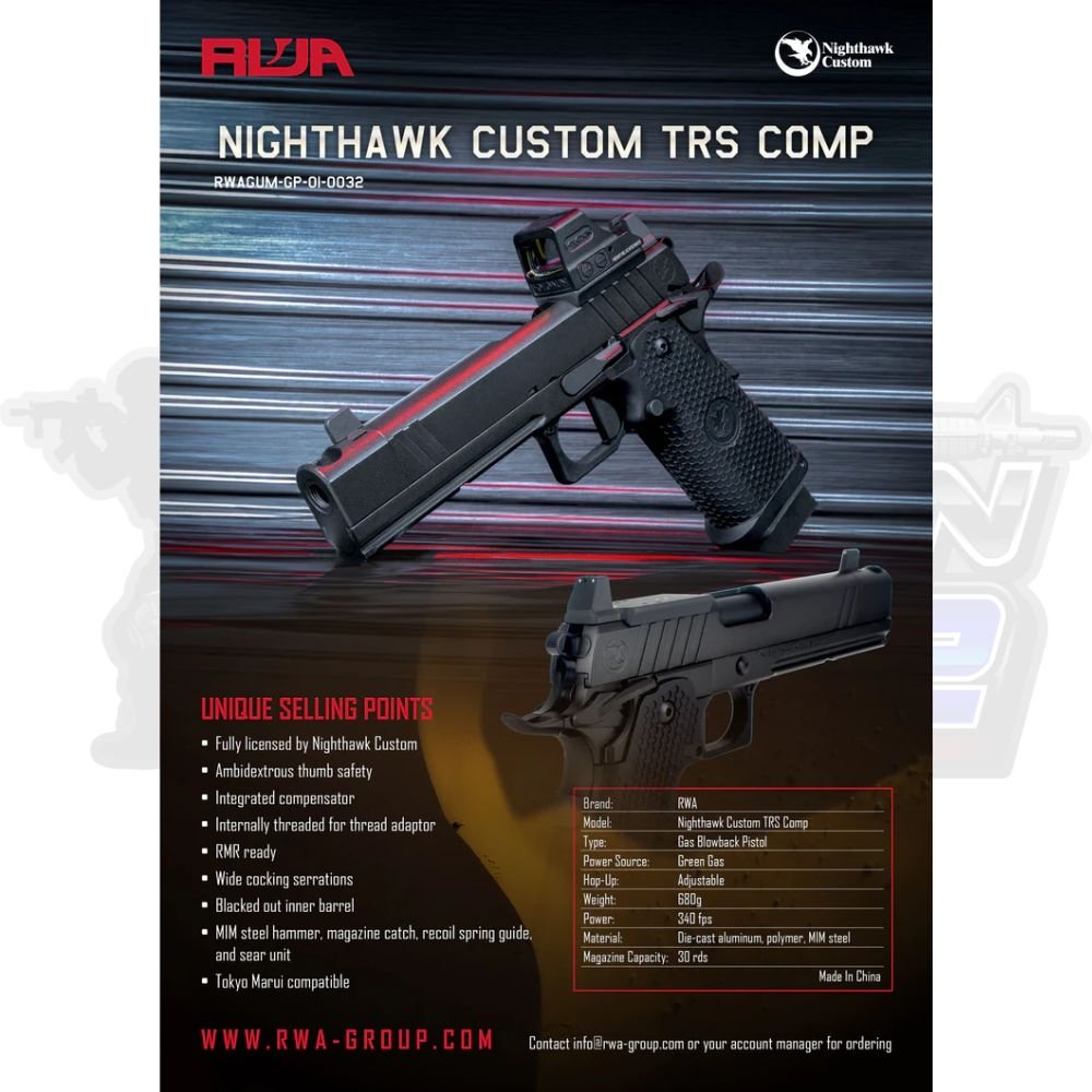 ข้อมูลของ Army Armament R402 ซึ่งเป็นโปรเจกต์ที่ทำร่วมกับ RWA (RedWolf Airsoft) ภายใต้ลิขสิทธิ์ถูกต้องจาก Nighthawk Custom โดยหลักๆ จะมี 2 รุ่นย่อยที่ใช้รหัส R402 คือ TRS Comp และ Sand Hawk